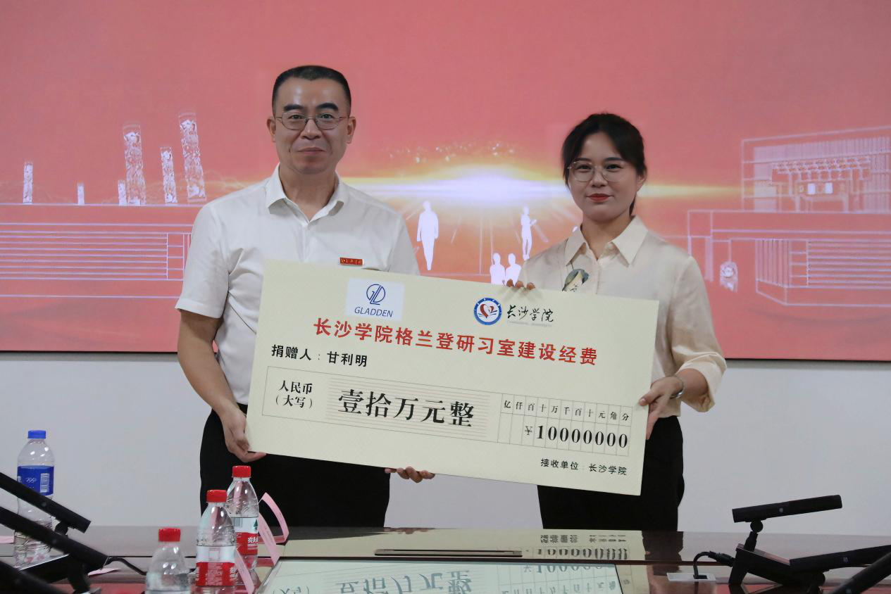 捐赠者为我校2007届英语专业校友、湖南格兰登进出口贸易有限公司总经理甘利明女士,她慷慨捐资10万元用于建设外国语学院学生研习室。甘利明表示,母校的培养之恩铭记于心,毕业多年,心中始终牵挂着校园的一草一木,能够参与母校的发展,既是荣誉也是责任。未来将继续支持校友回湘工作,以实际行动参与到母校的高质量内涵式发展中来。