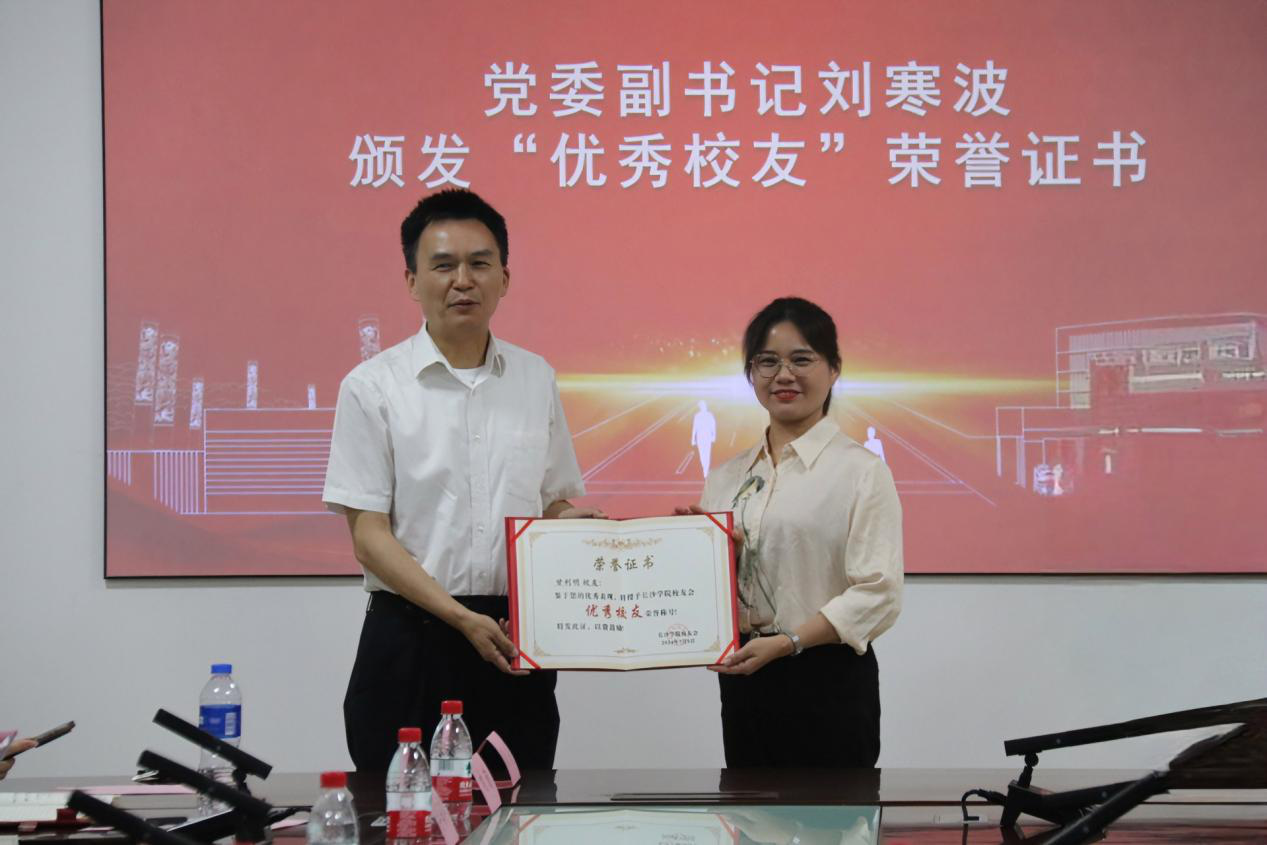 捐赠仪式上,何利华代表学校接受甘利明校友的捐赠,刘寒波为甘利明颁发“优秀校友”荣誉证书。